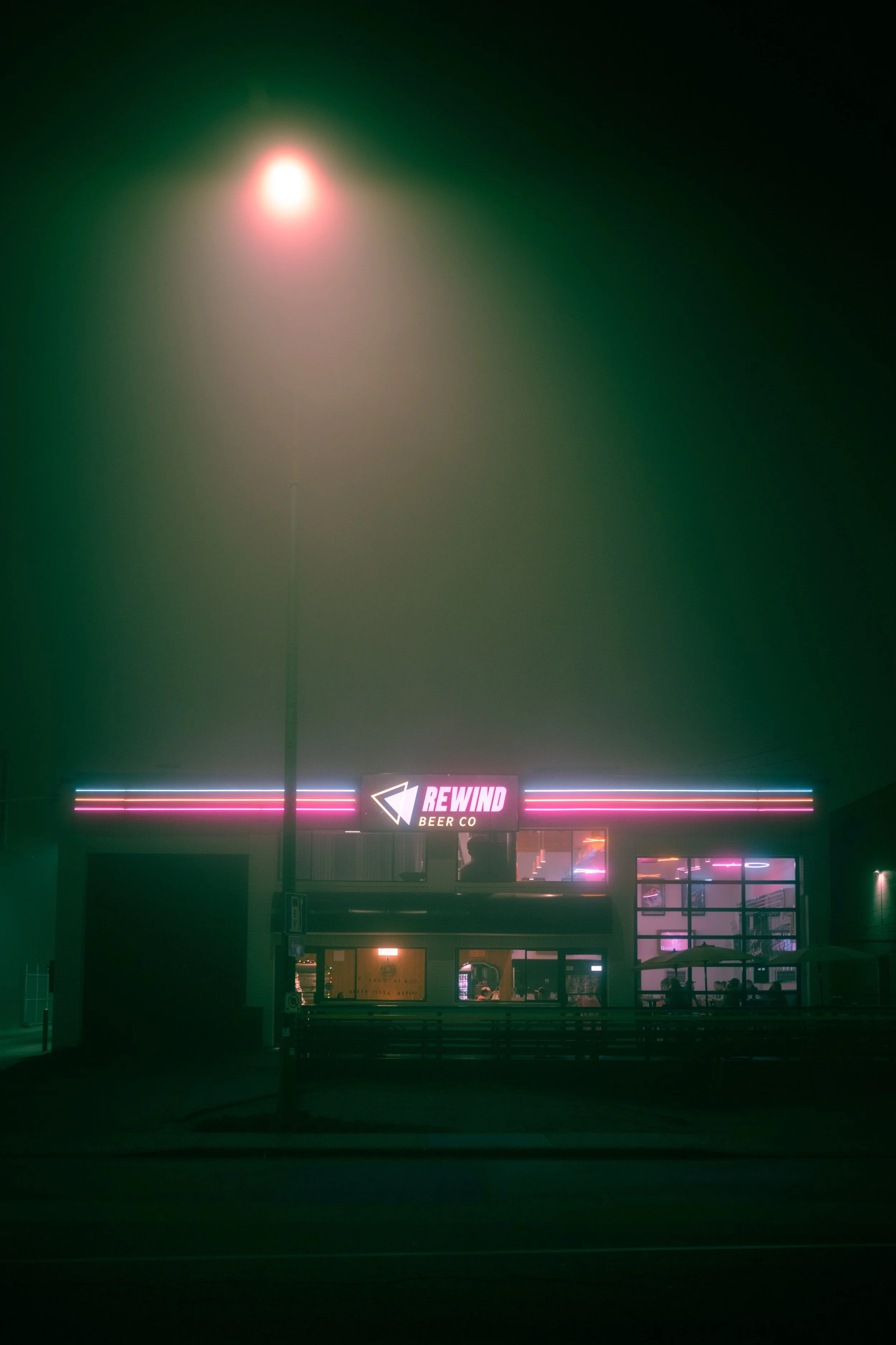 Neon-lit building named 'Rewind Beer Co.' on a foggy night with pink, purple, and blue lighting.