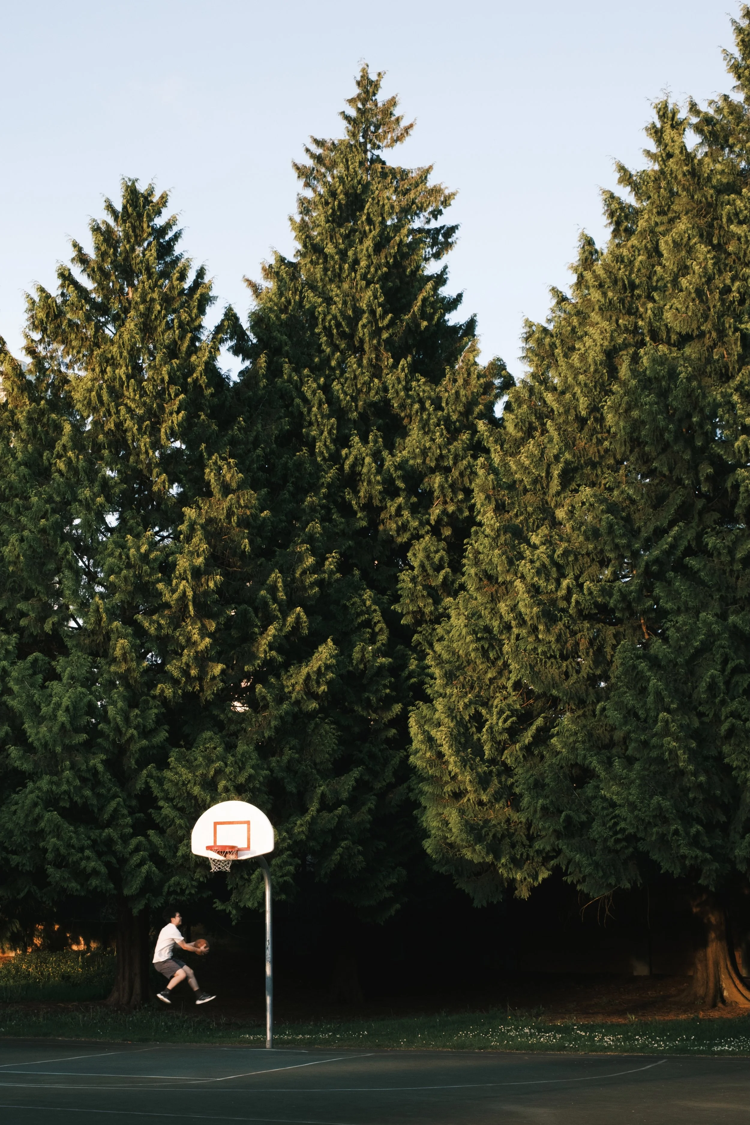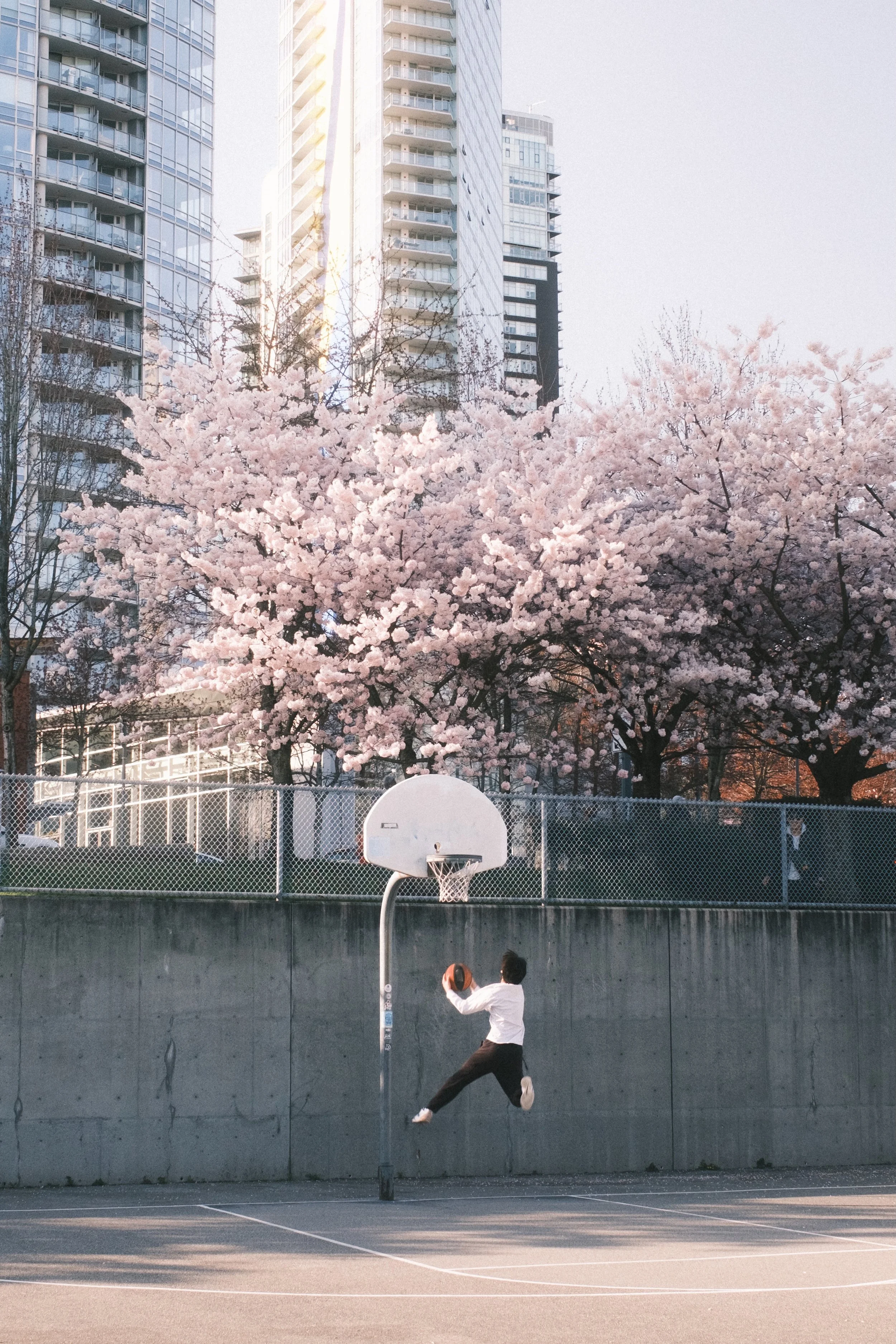 A person jumping to make a shot in a basketball hoop on an outdoor court, with pink cherry blossom trees and tall buildings in the background.