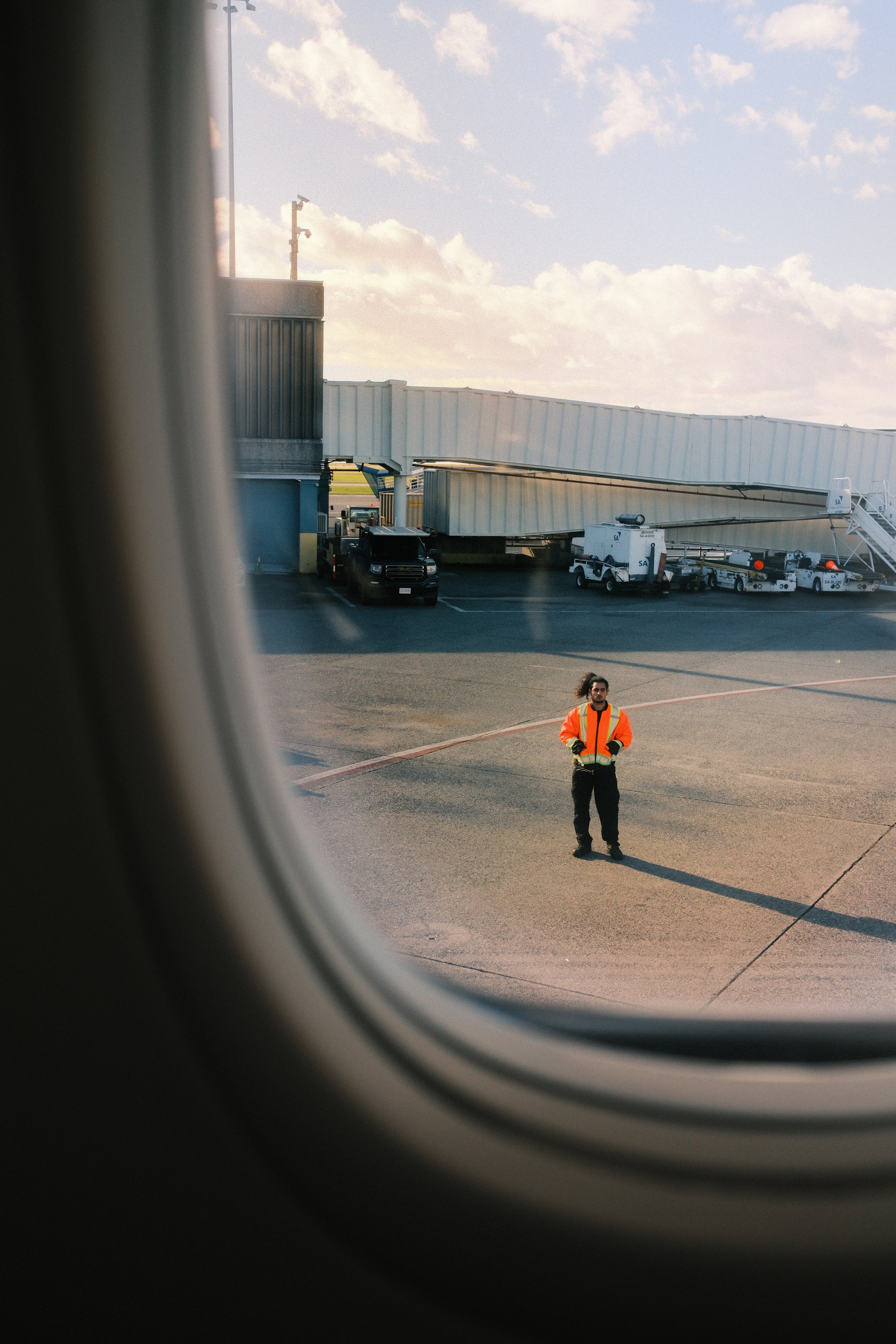 A person in an orange safety jacket standing on an airport tarmac near an airplane window, with airport vehicles and jet bridges in the background.