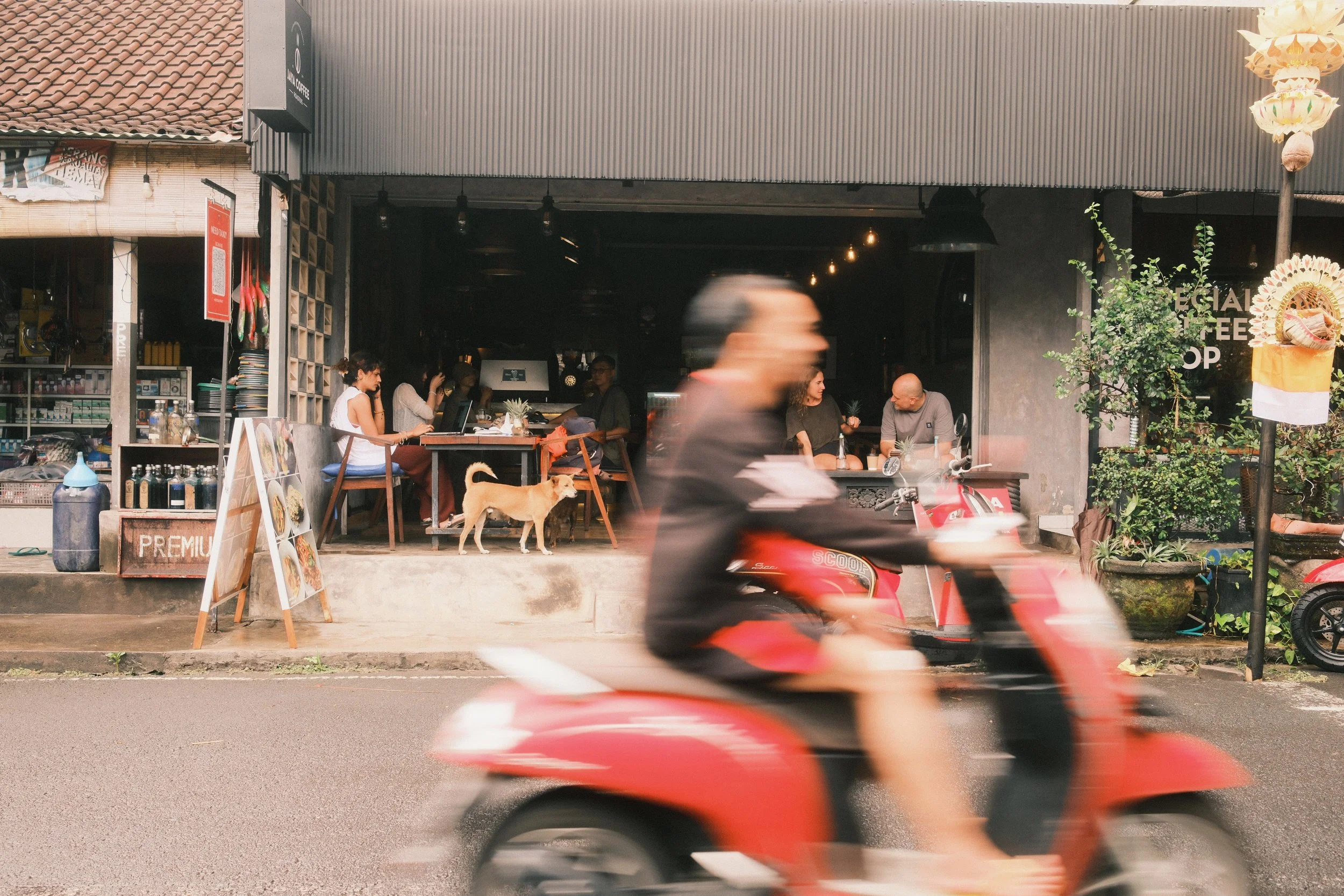 A street view shows a cafe with people inside and outside. A man is riding a red scooter past the cafe, blurred due to motion. Inside, people are sitting at tables, and a dog is standing near a woman at one of the tables.