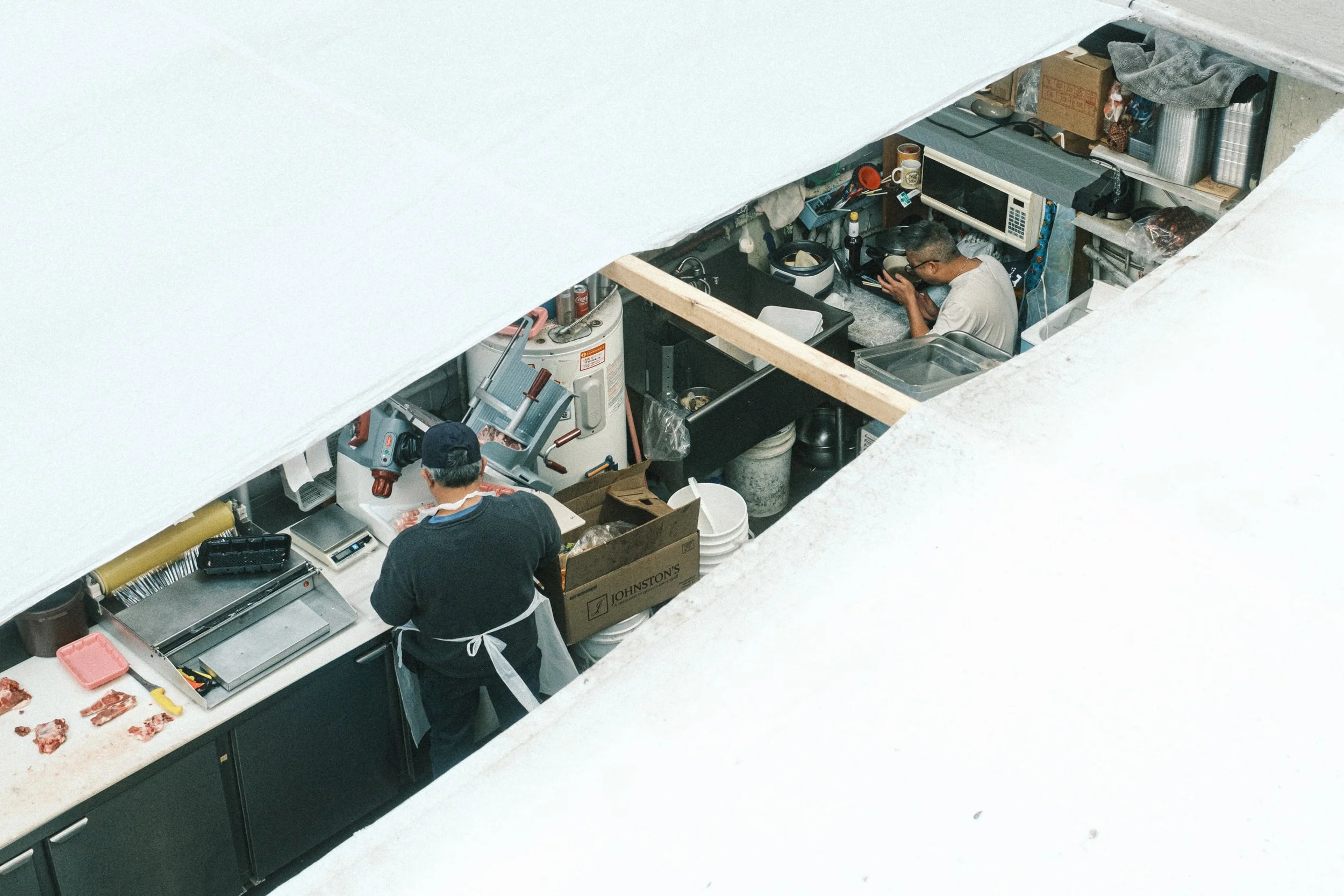 Two people working in a small, cluttered kitchen, one preparing meat at the counter and the other sitting and eating near the microwave.