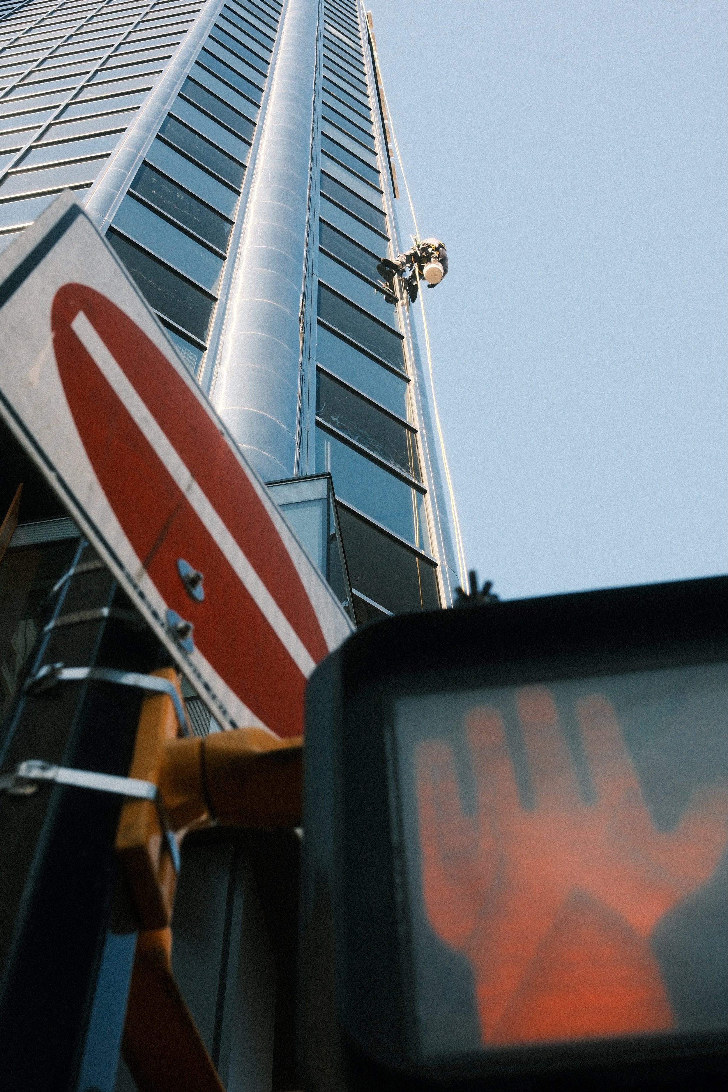 A worker cleaning the exterior windows of a tall modern glass skyscraper with a rope. In the foreground, there is a stop sign and a digital display showing a red hand signal.
