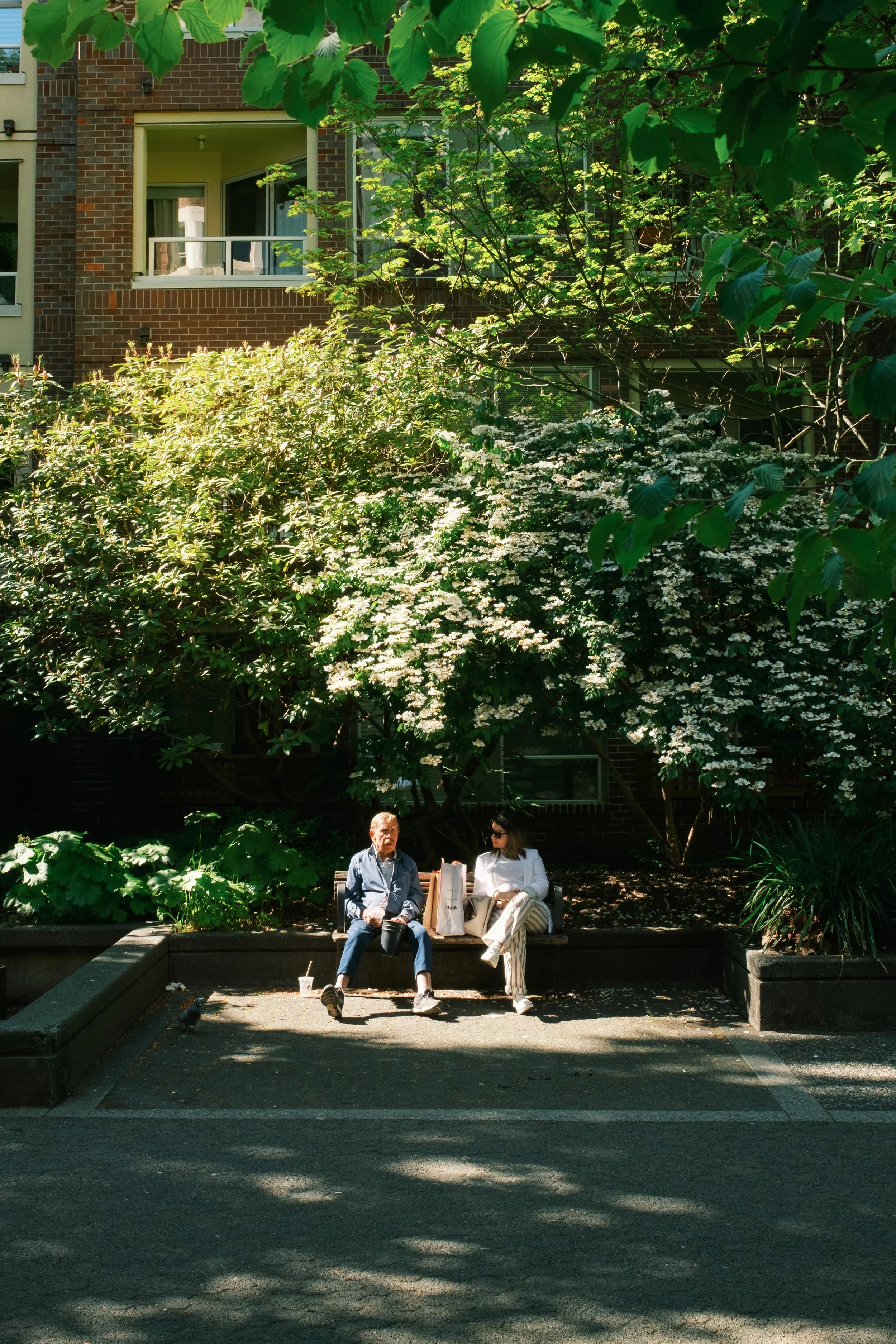 Two people sitting on a park bench under large leafy trees in a city park, with a brick building in the background.