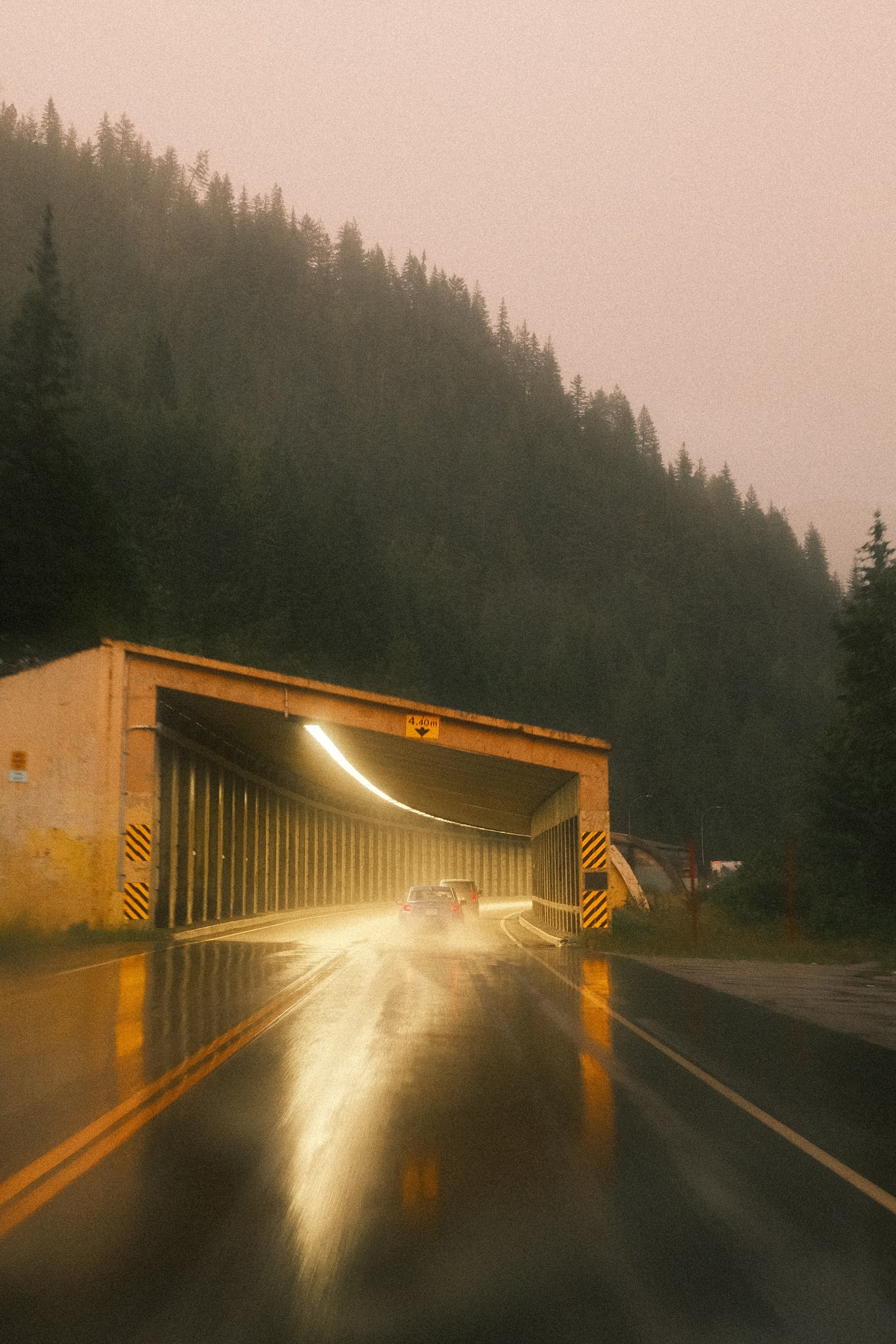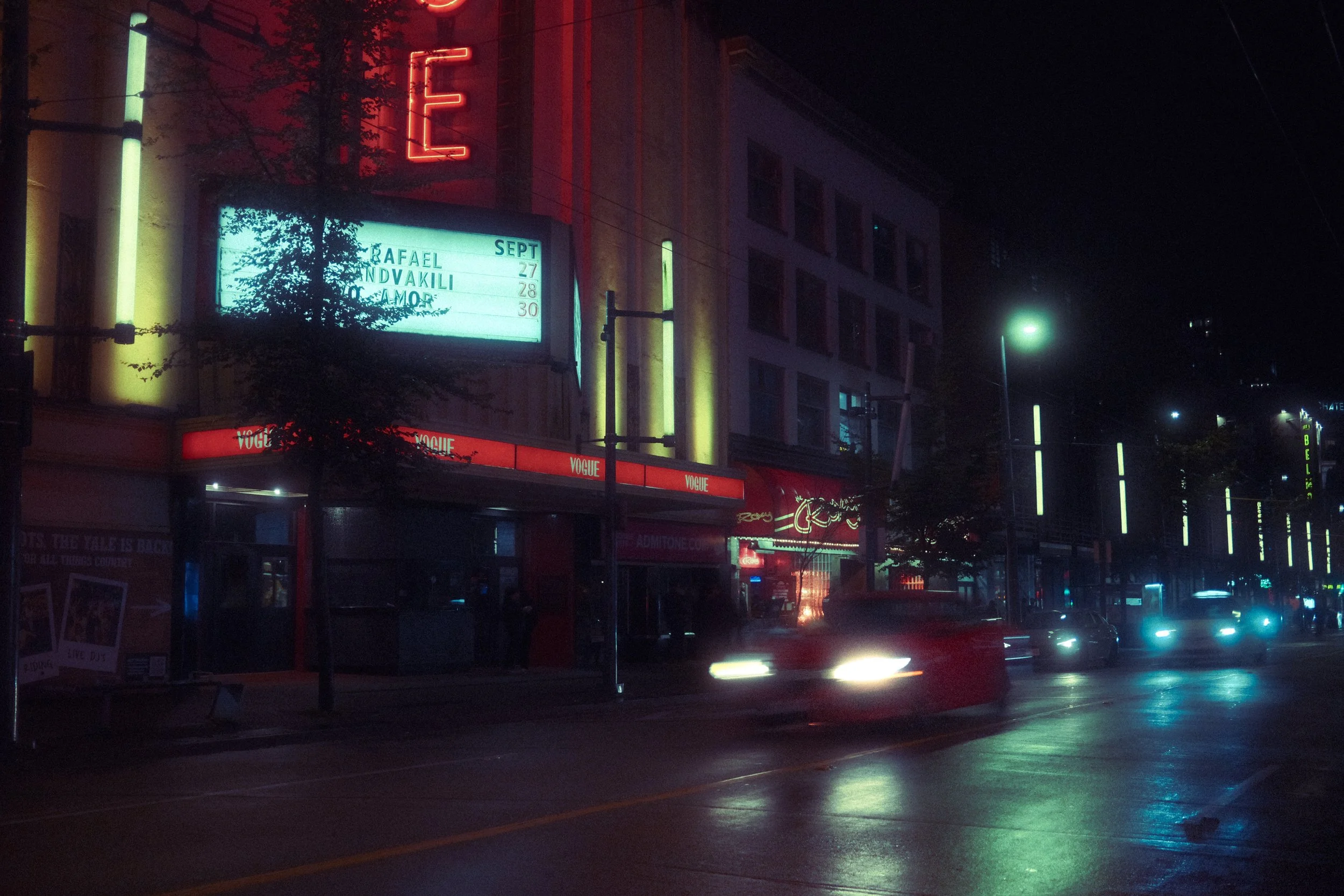 Night city street scene with illuminated neon signs on buildings, cars driving with headlights on, wet street reflecting lights, and a digital marquee displaying dates and names.