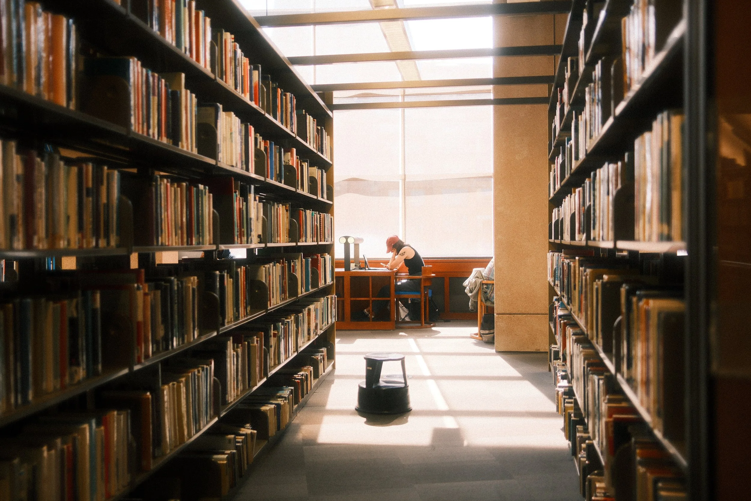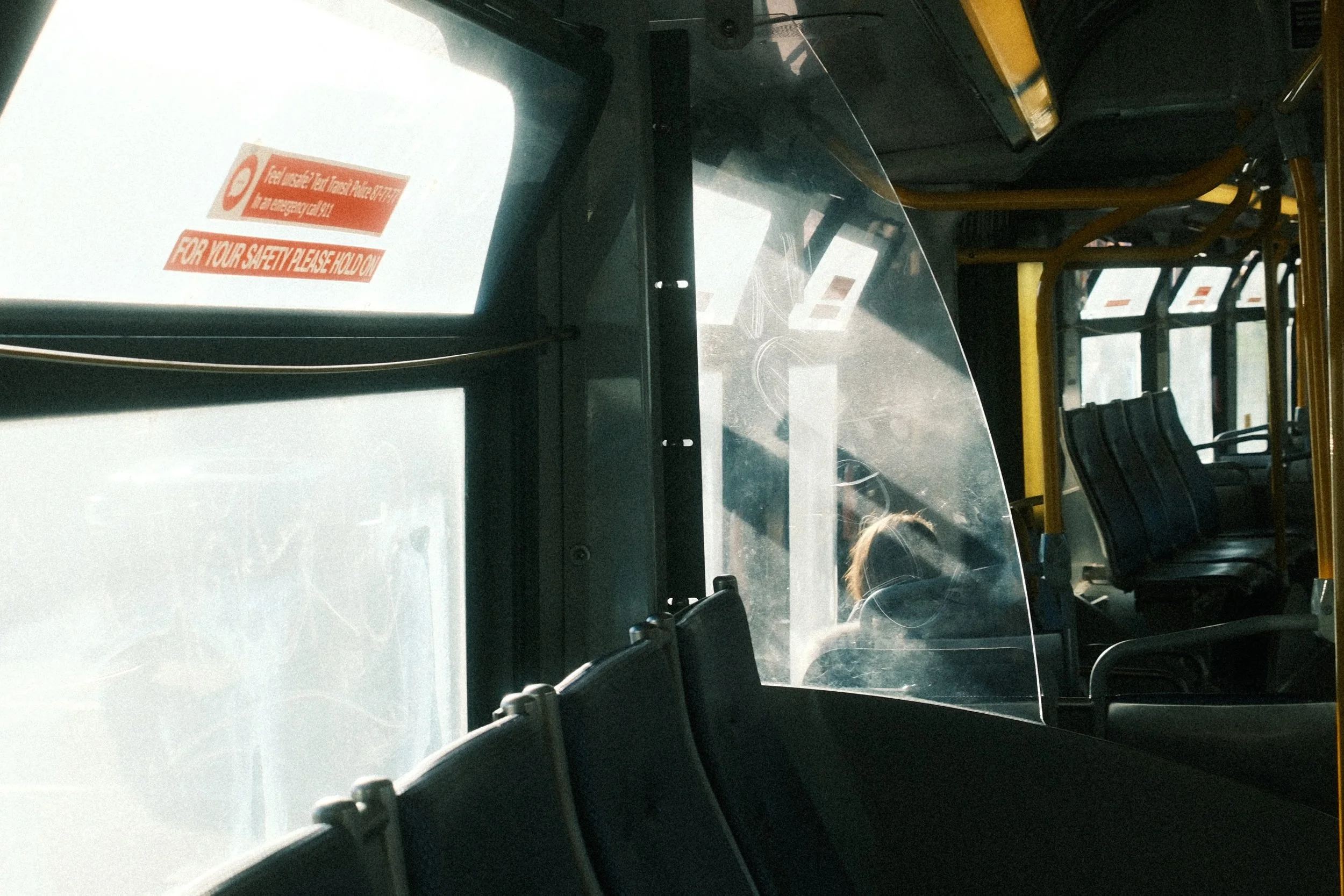 Inside a bus, empty seats with black upholstery, a passenger with blonde hair sitting near the window, safety notices on the windows, and bright natural light coming in.
