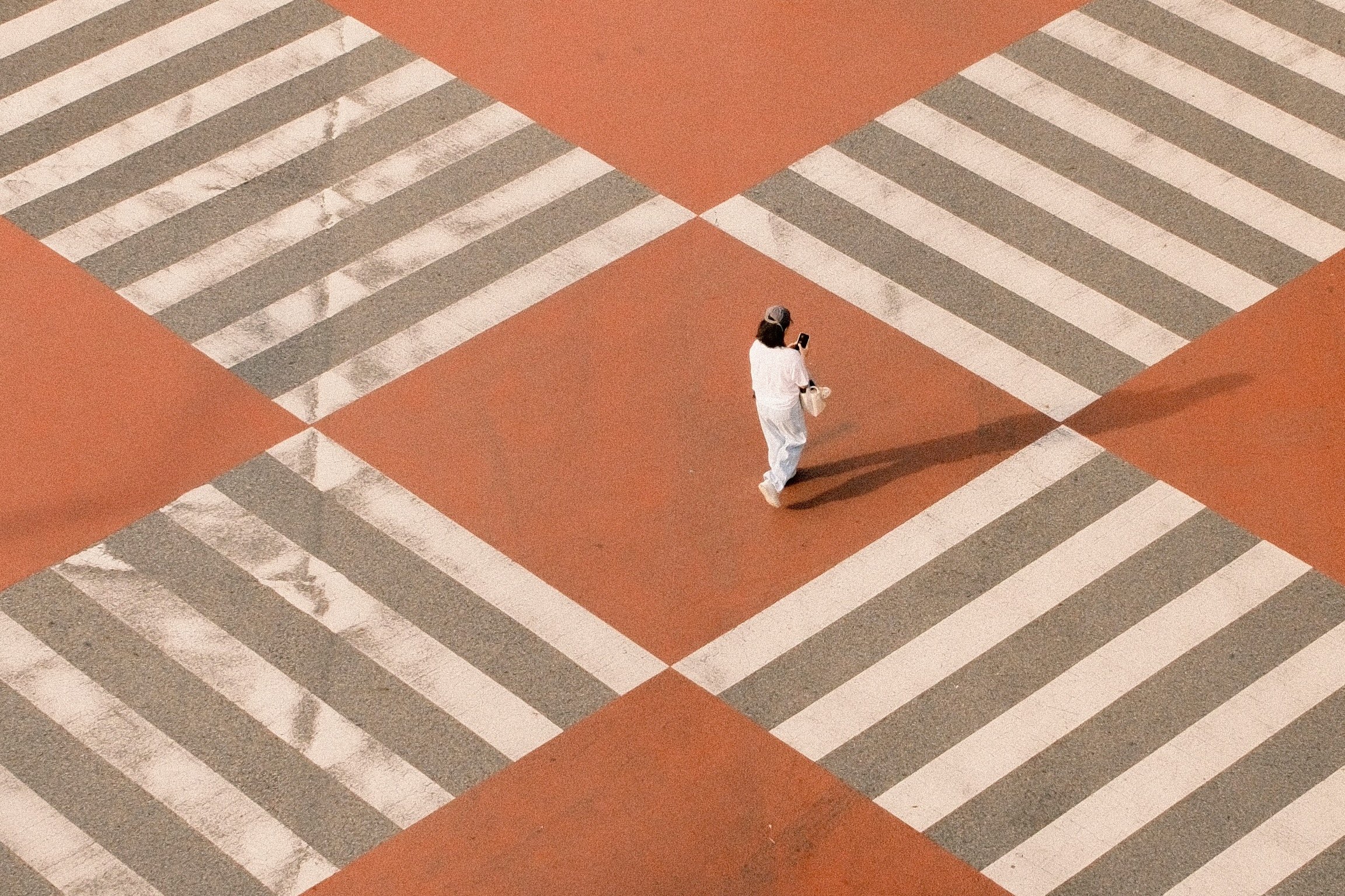 A woman in white clothing walking across a crosswalk, looking at her phone, with red and gray-striped pavement and shadows.