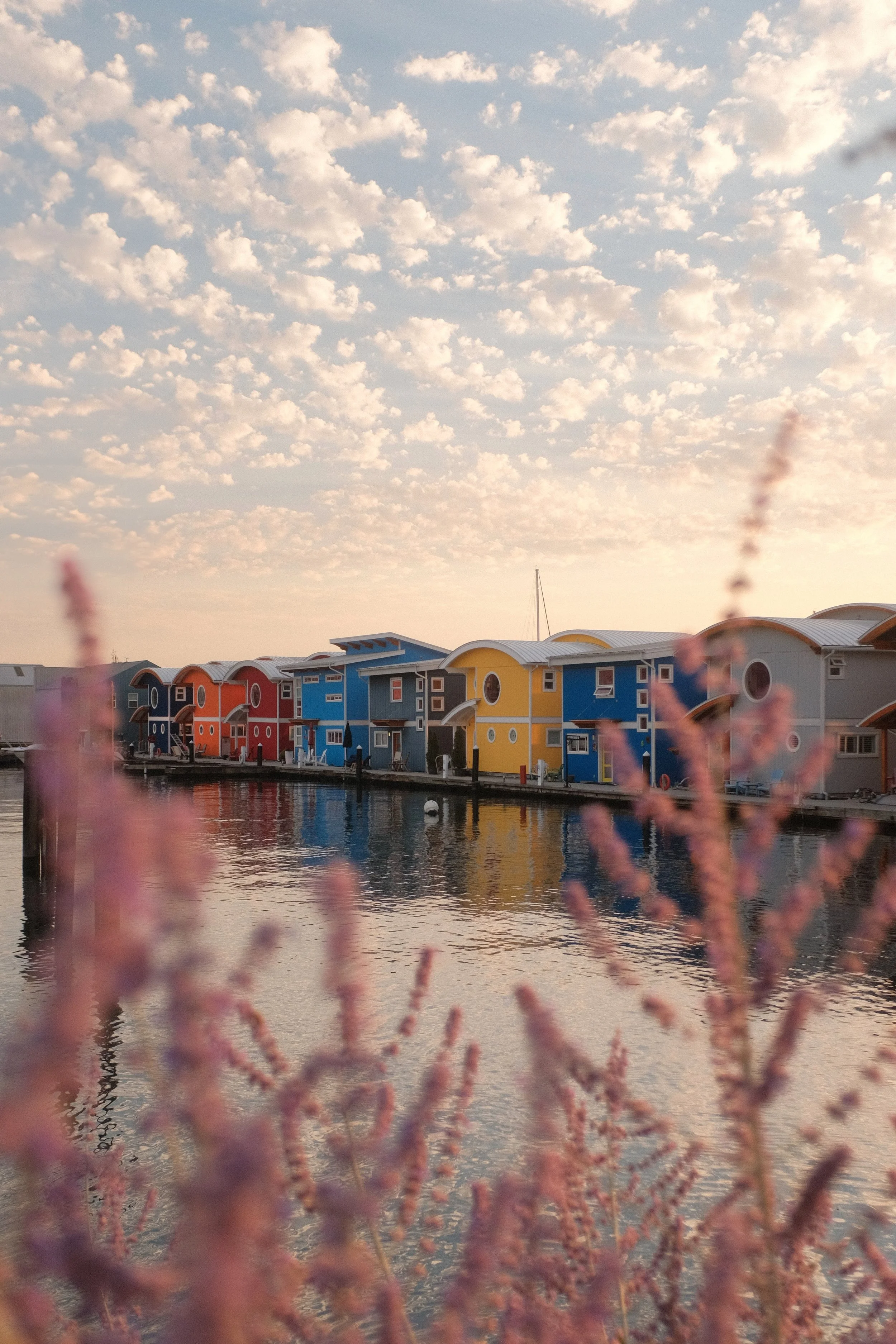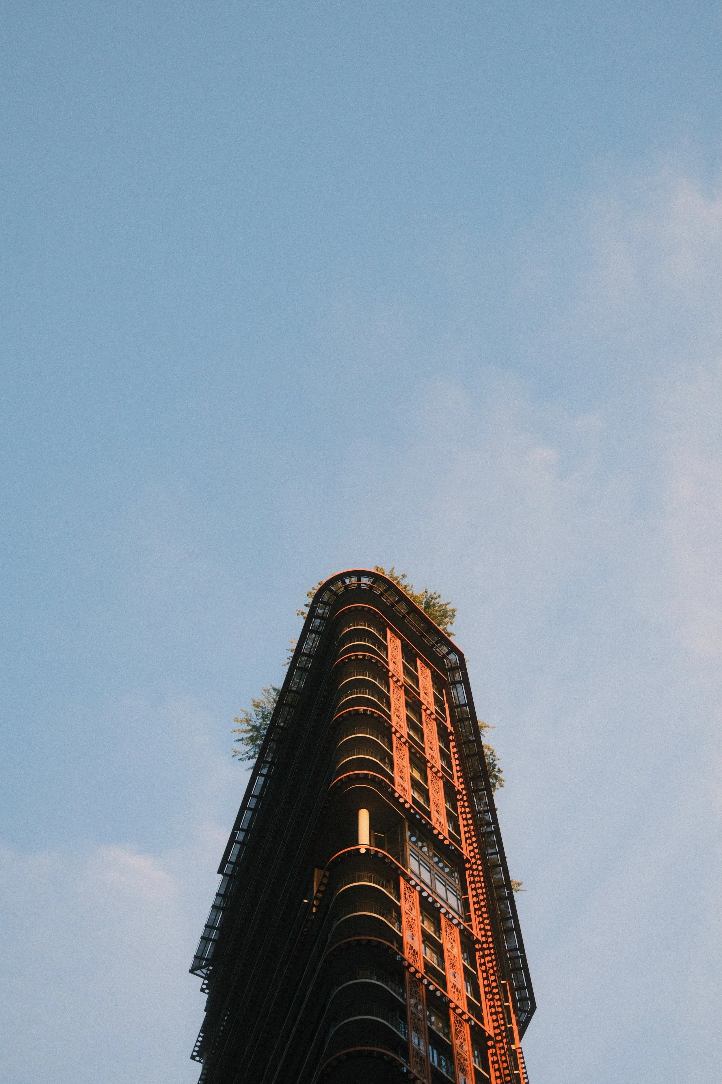 Low-angle view of a tall, modern building with curved balconies and orange decorative panels, against a blue sky with some clouds.