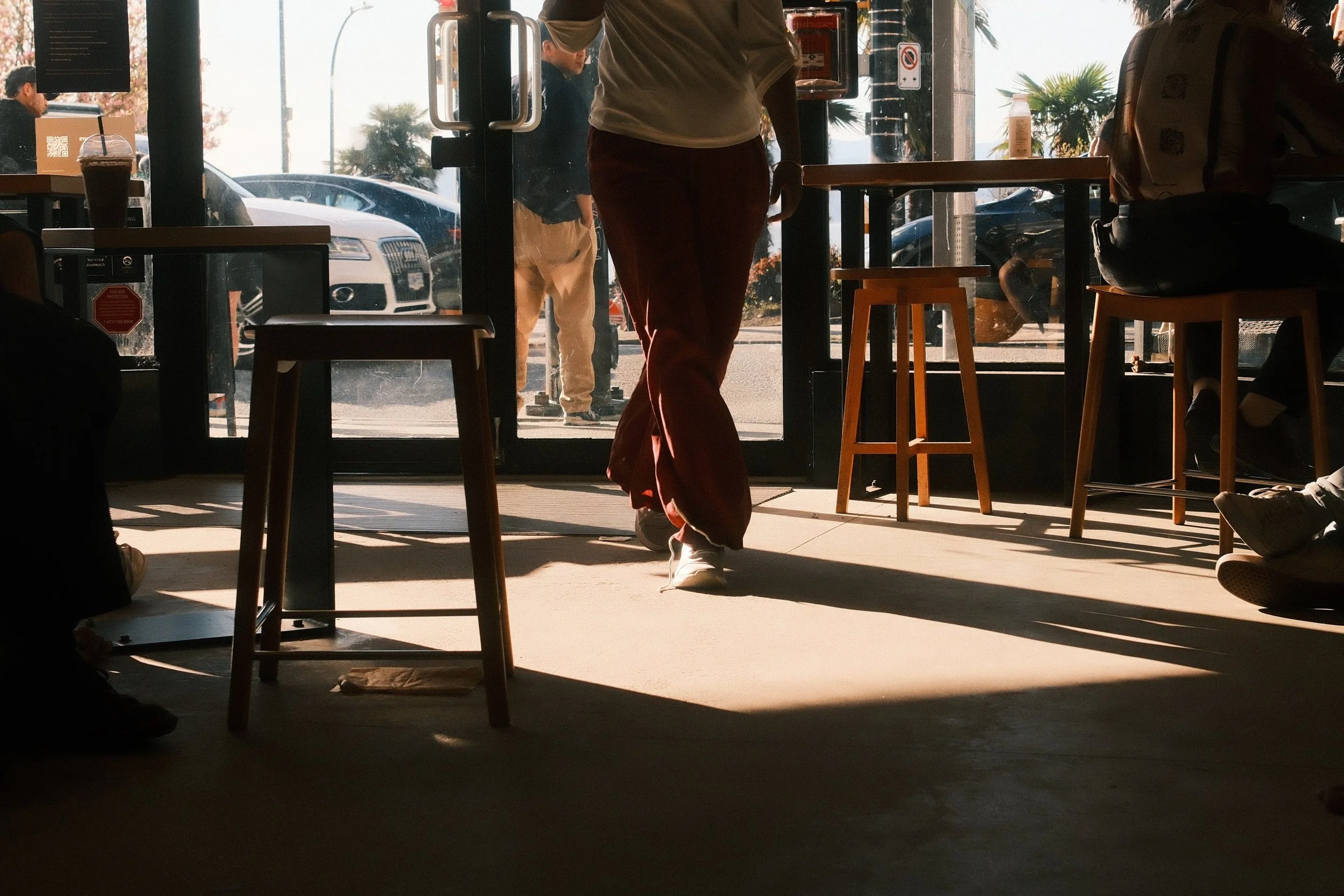 People inside a coffee shop with sunlight streaming through the front windows, casting shadows on the floor.