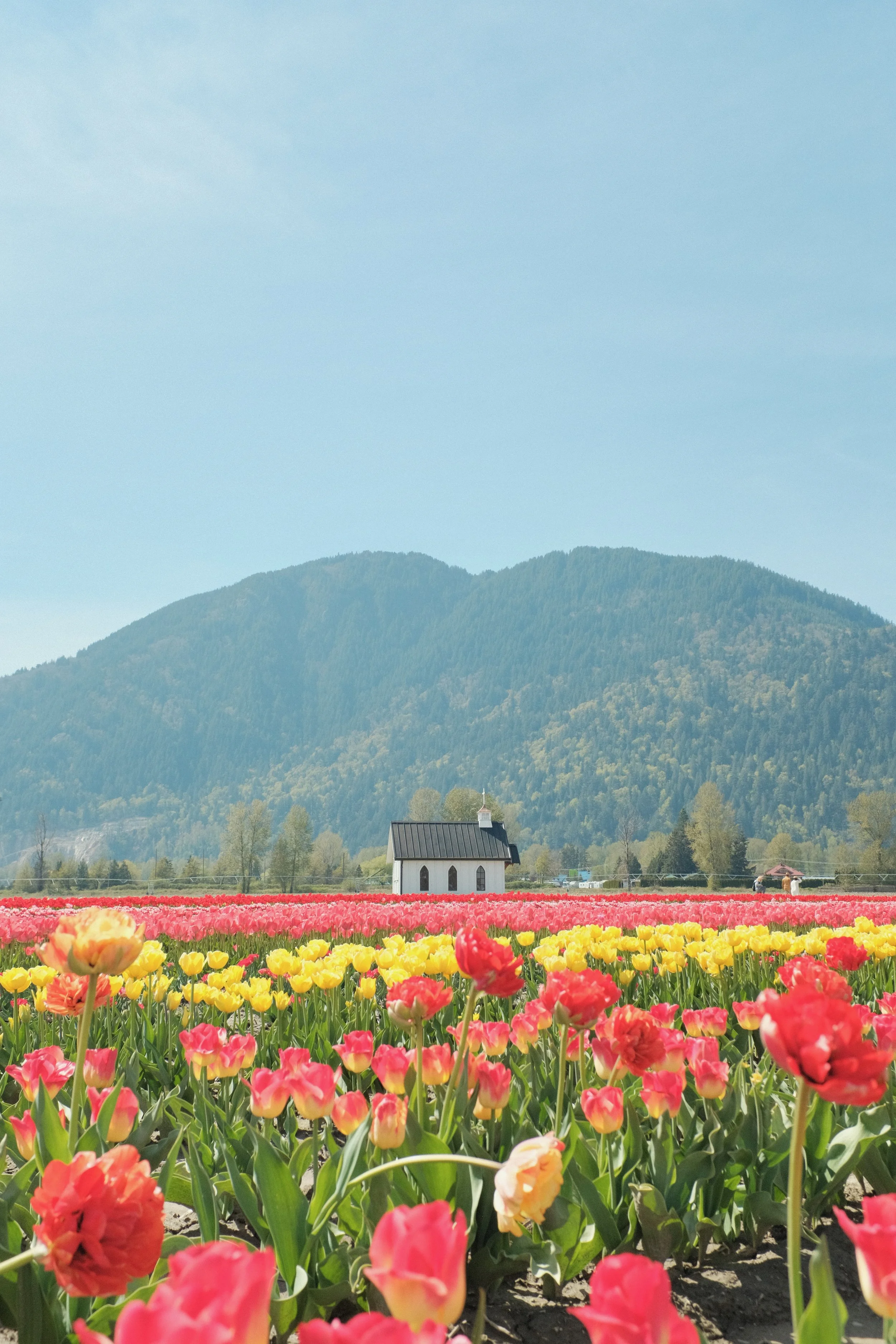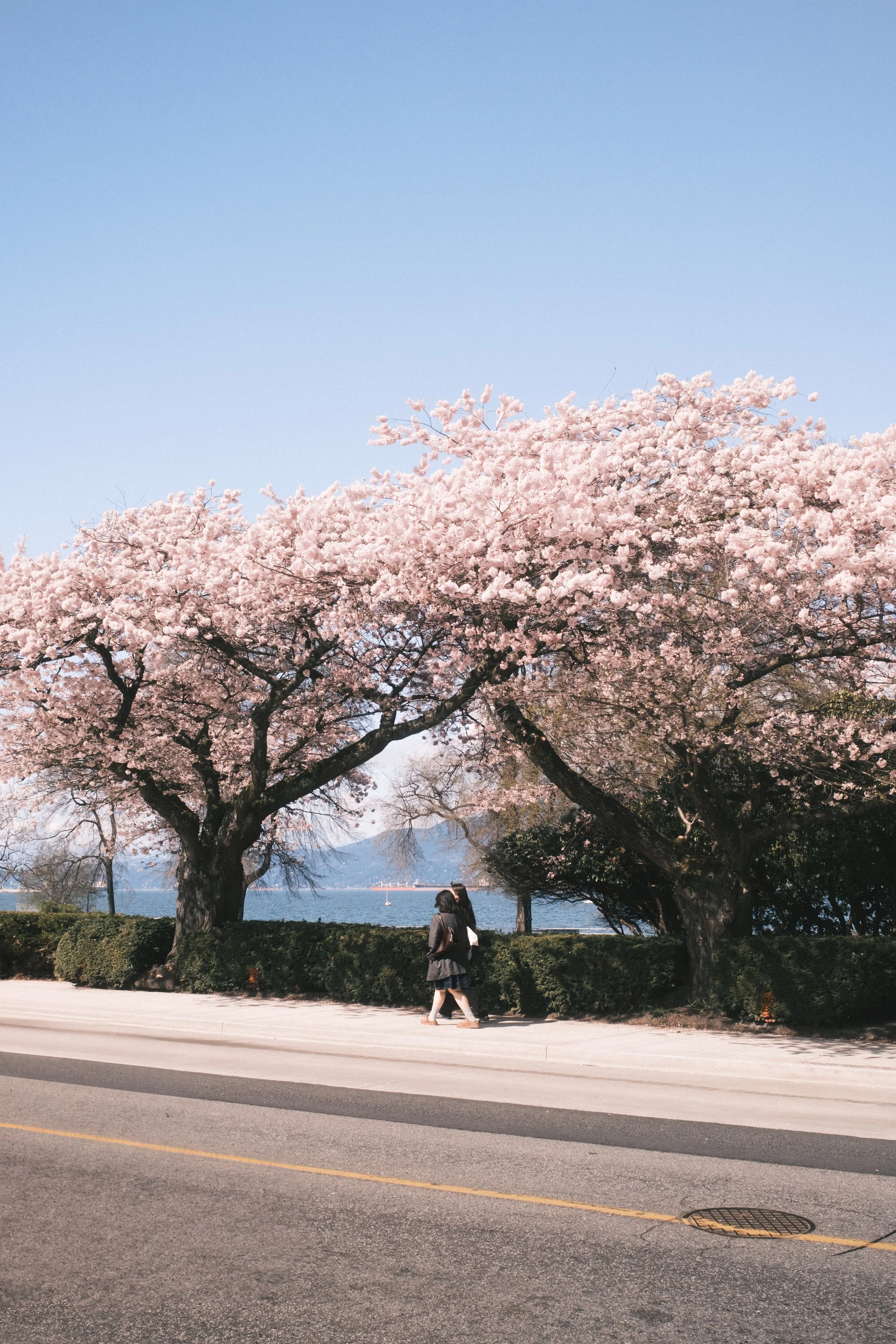 Two people walking along a sidewalk near cherry blossom trees with a body of water and hills in the background.