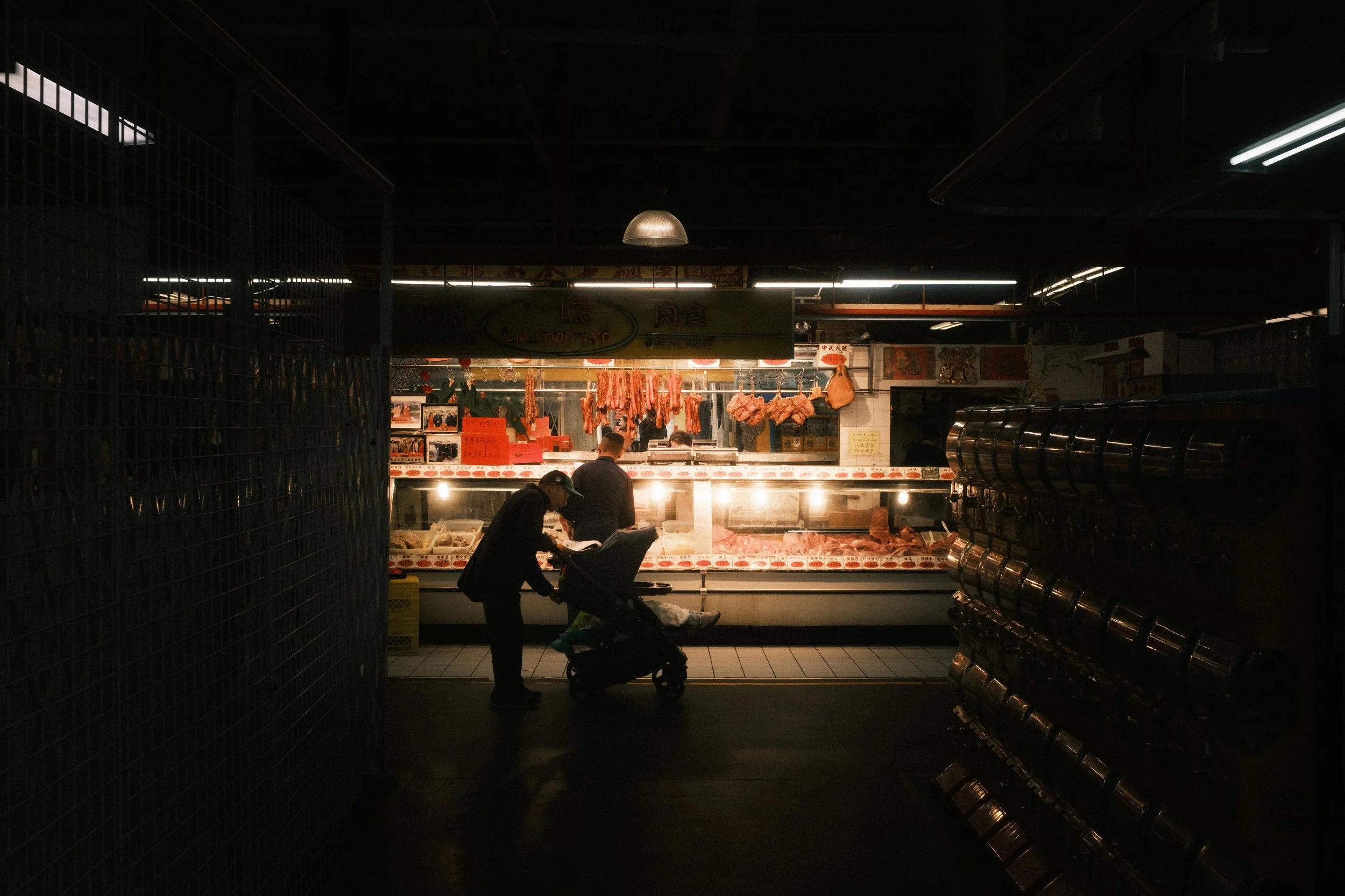Inside a dimly lit supermarket or butcher shop with meat displayed in a glass case, hanging meats, and two people inspecting items, one pushing a shopping cart.