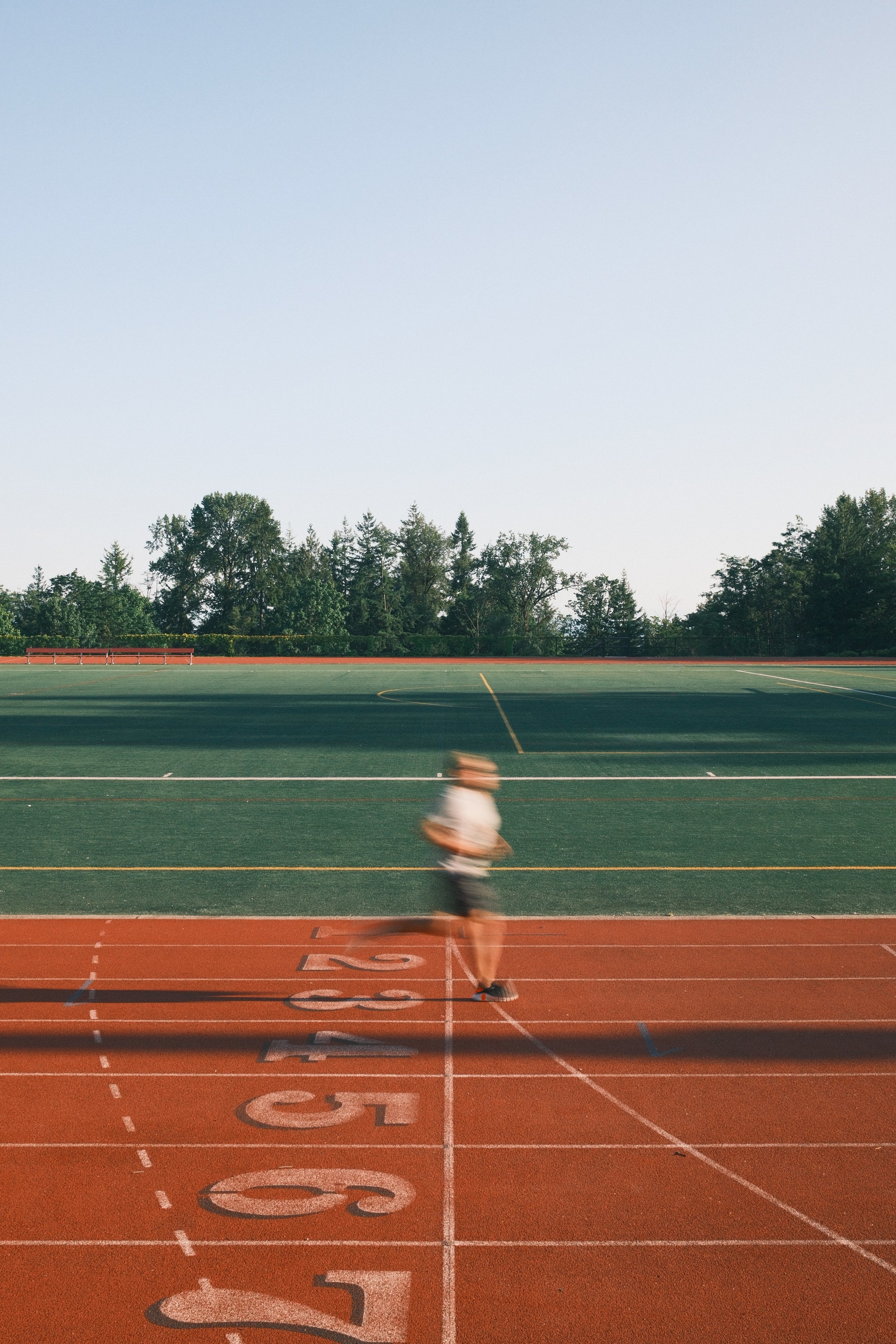 A person running on a red track at an outdoor athletic field with green grass and trees in the background, blurred due to motion.