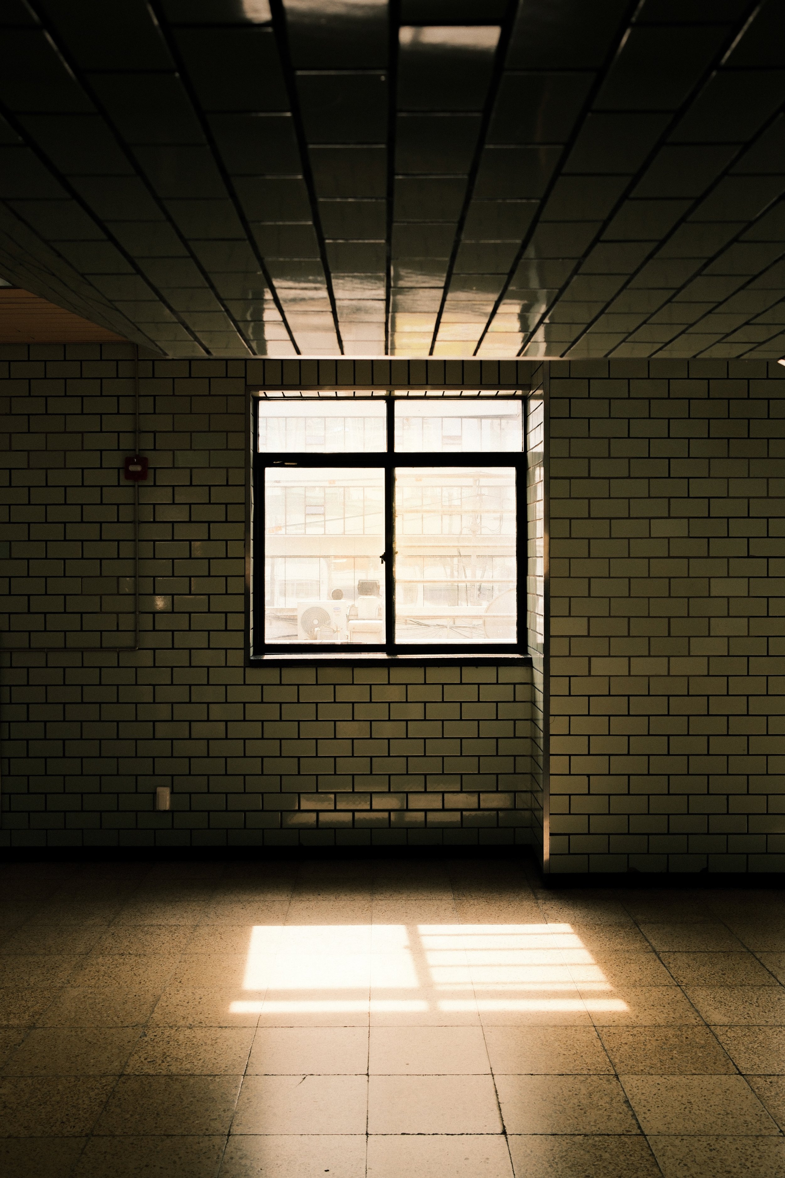 Interior scene of an empty room with a large window and grid pattern shadows cast on the floor by sunlight