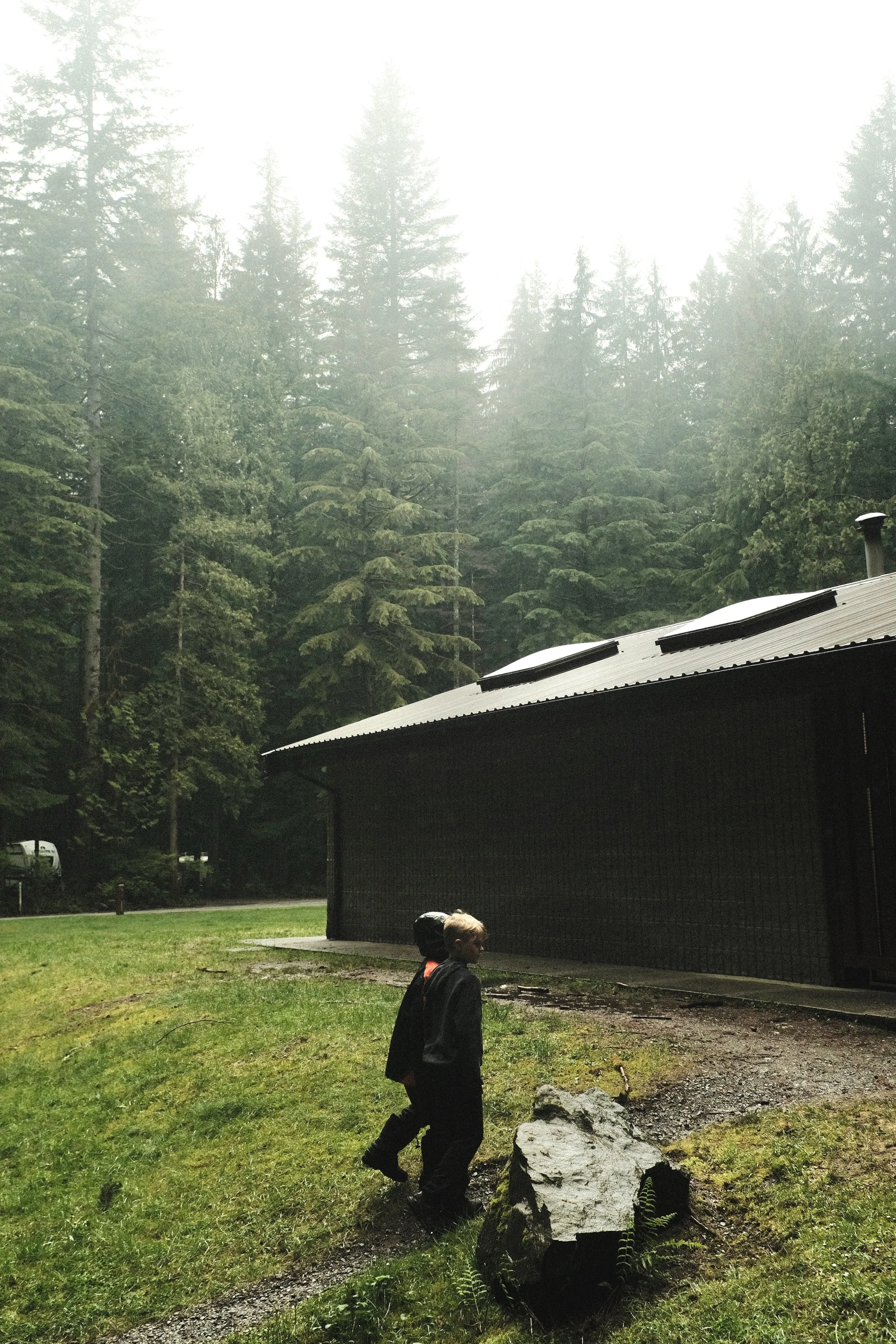 Two people with luggage walking out of a building with brick and stone exterior, dark windows, and black lamps, during daytime.