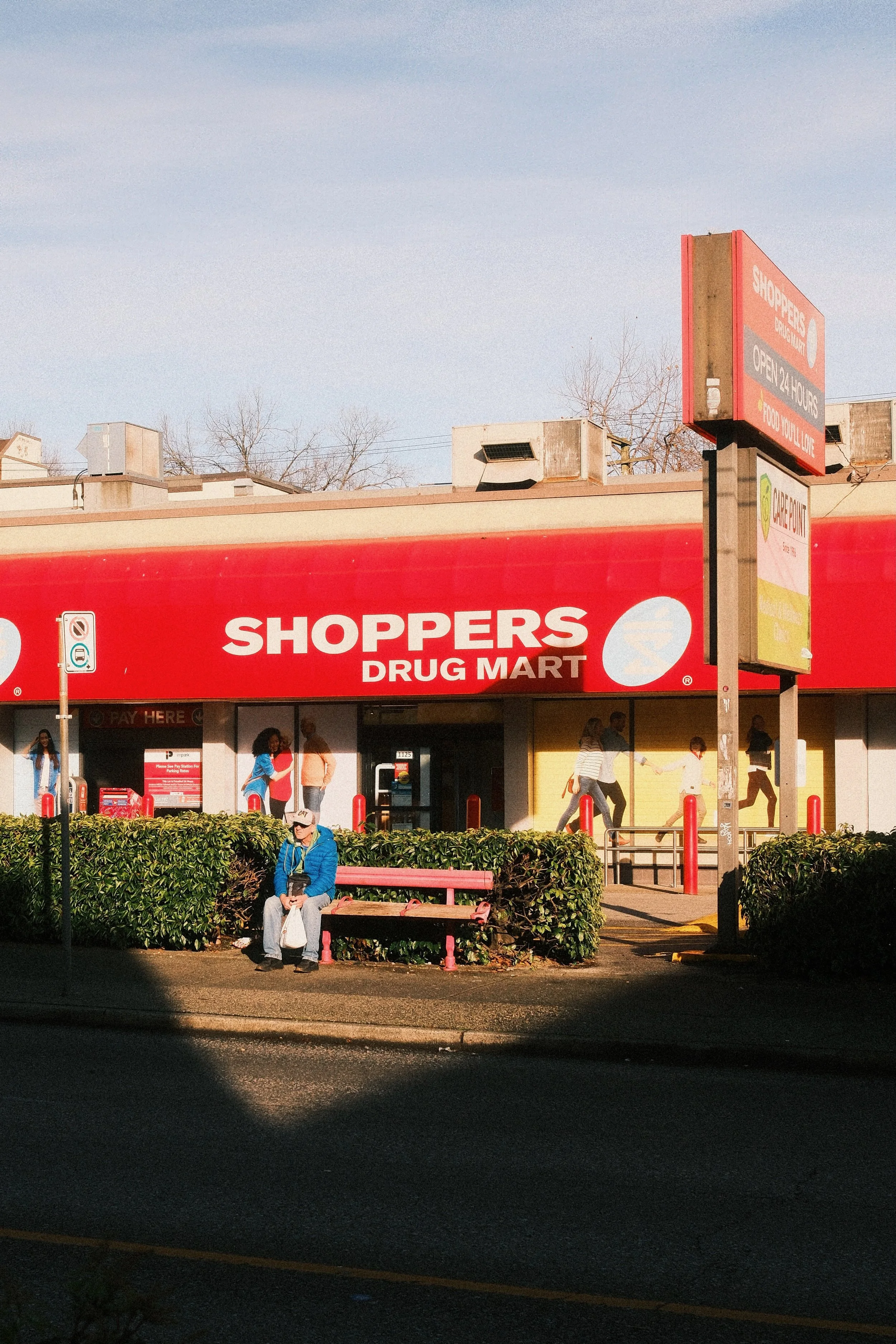 A storefront of Shoppers Drug Mart with red signage, people walking on the sidewalk, a person sitting on a pink bench, and a parking sign in the foreground.