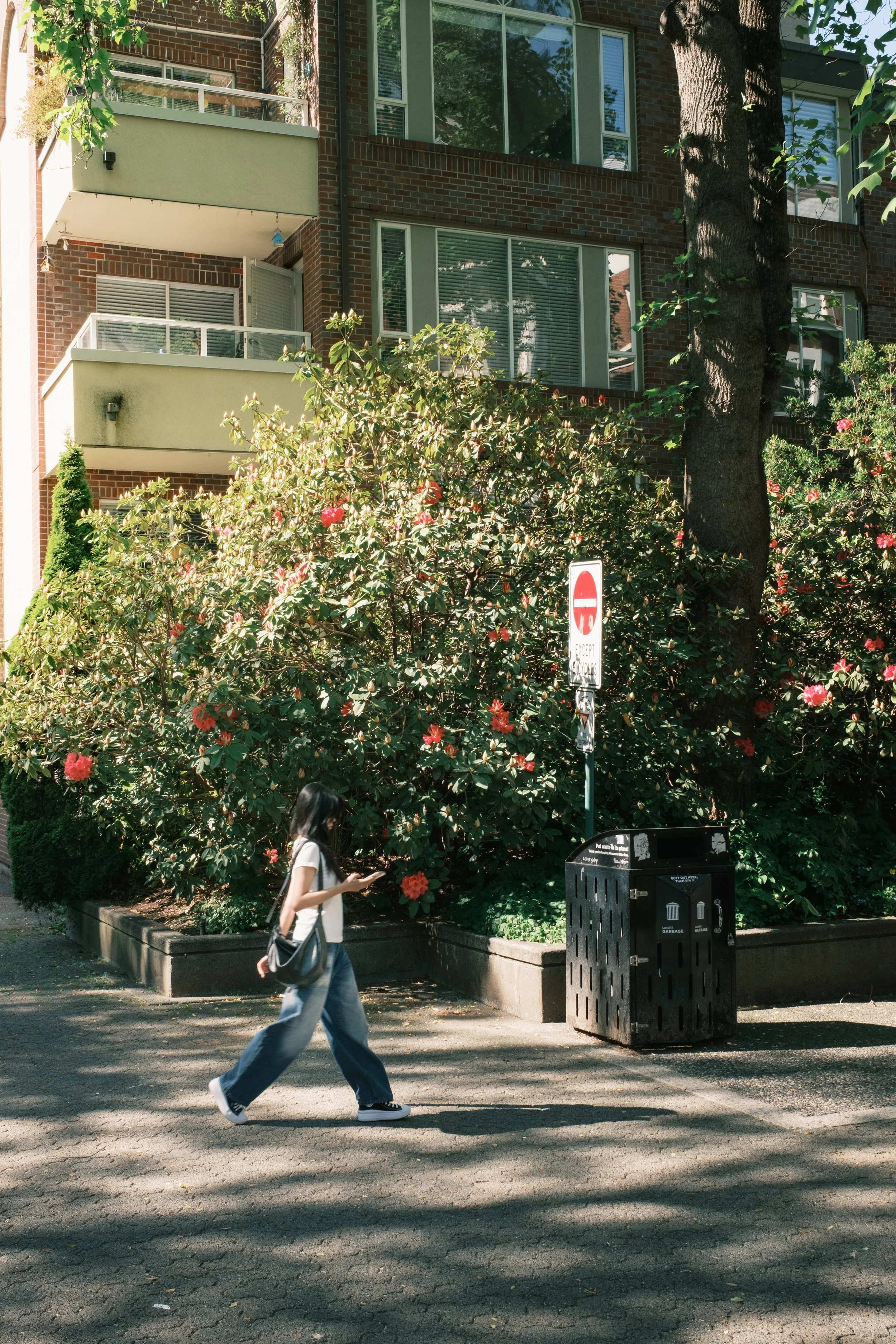 A woman with black hair, wearing a white T-shirt and blue jeans, is walking on a sidewalk past bushes with red flowers. There is a black trash can and a no-entry street sign nearby. In the background, there is a multi-story brick apartment building w