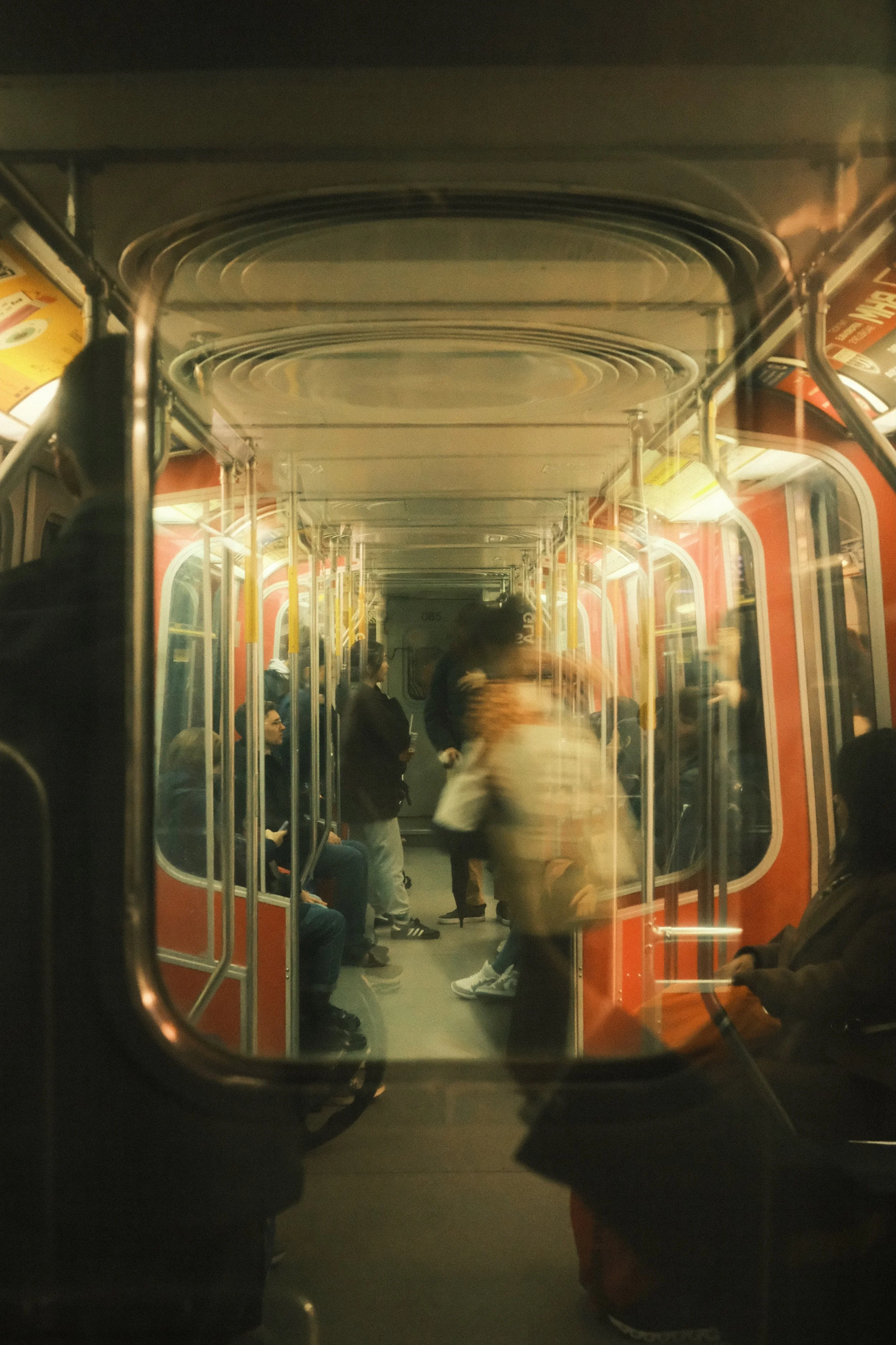 Inside a subway train with passengers sitting and standing, seen through a window with reflections.