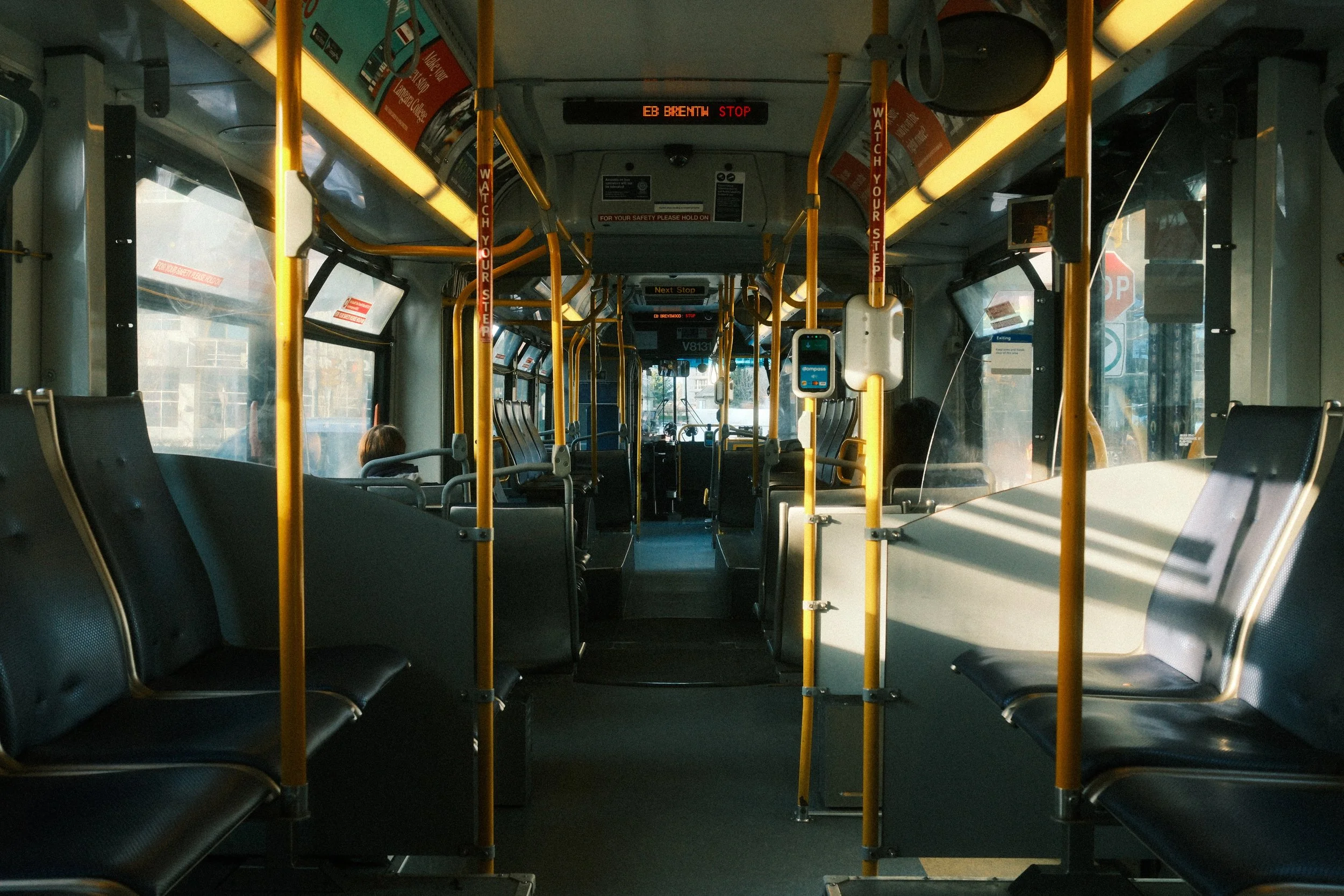 Inside a city bus with empty seats and a few passengers, showing yellow bars, digital stops display, and sunlight streaming through the windows.