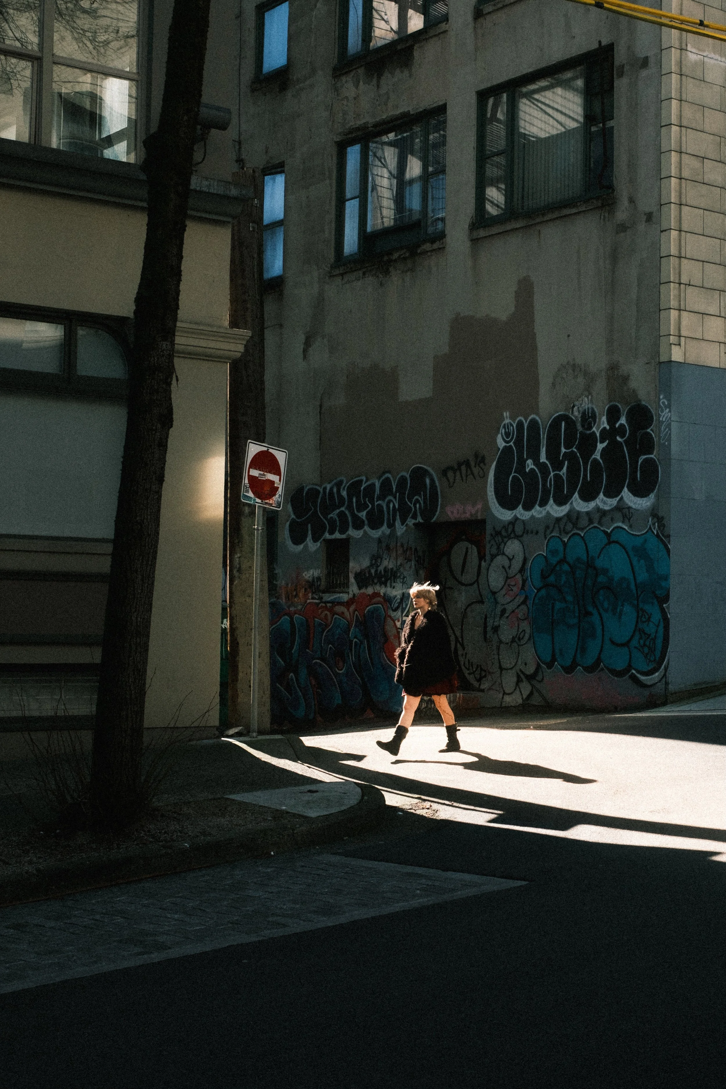 A woman walking on a city street in the sunlight with graffiti on a building wall behind her.