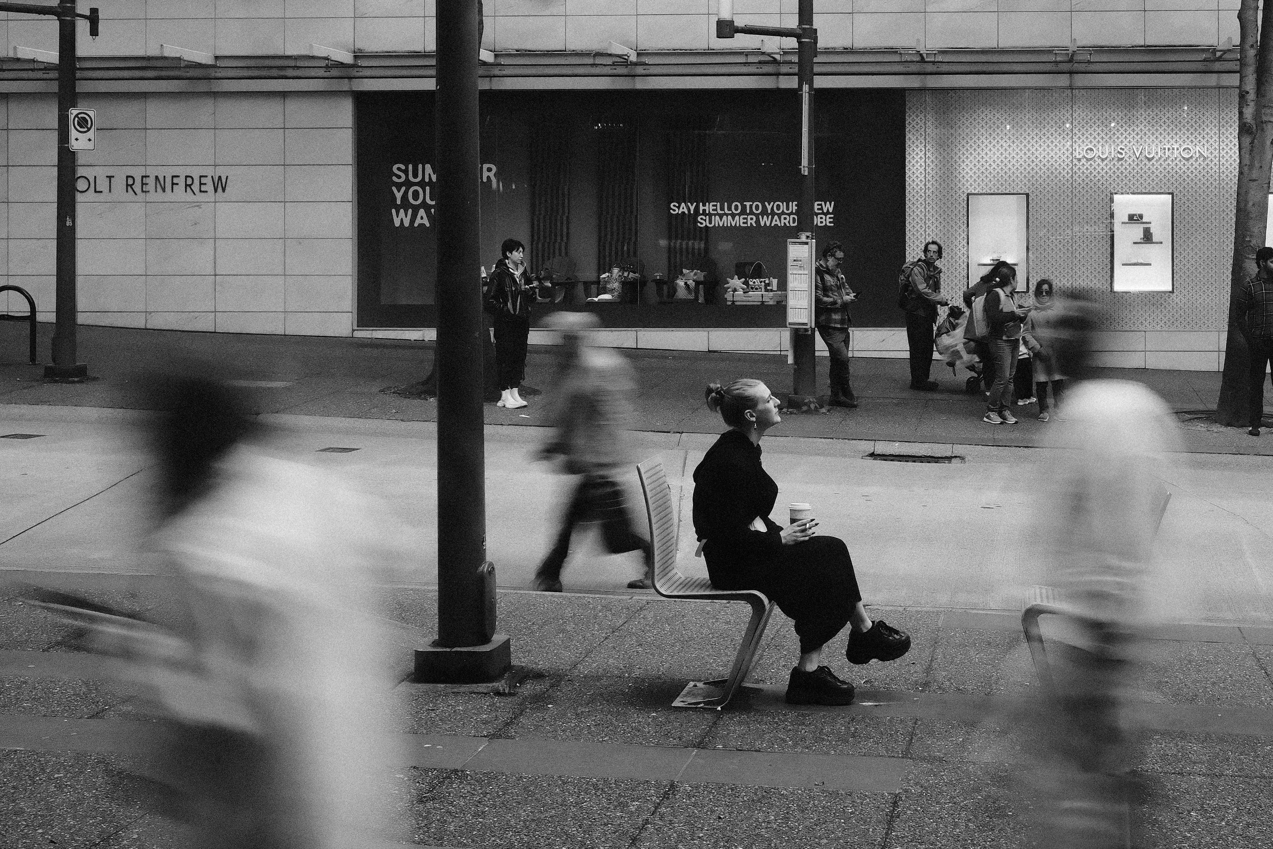 A black and white photo of a city street with people walking past them on a sidewalk with a woman sitting on a bench holding a coffee cup, while others walk blurred in motion in front of the scene, and storefronts with signs in the background.